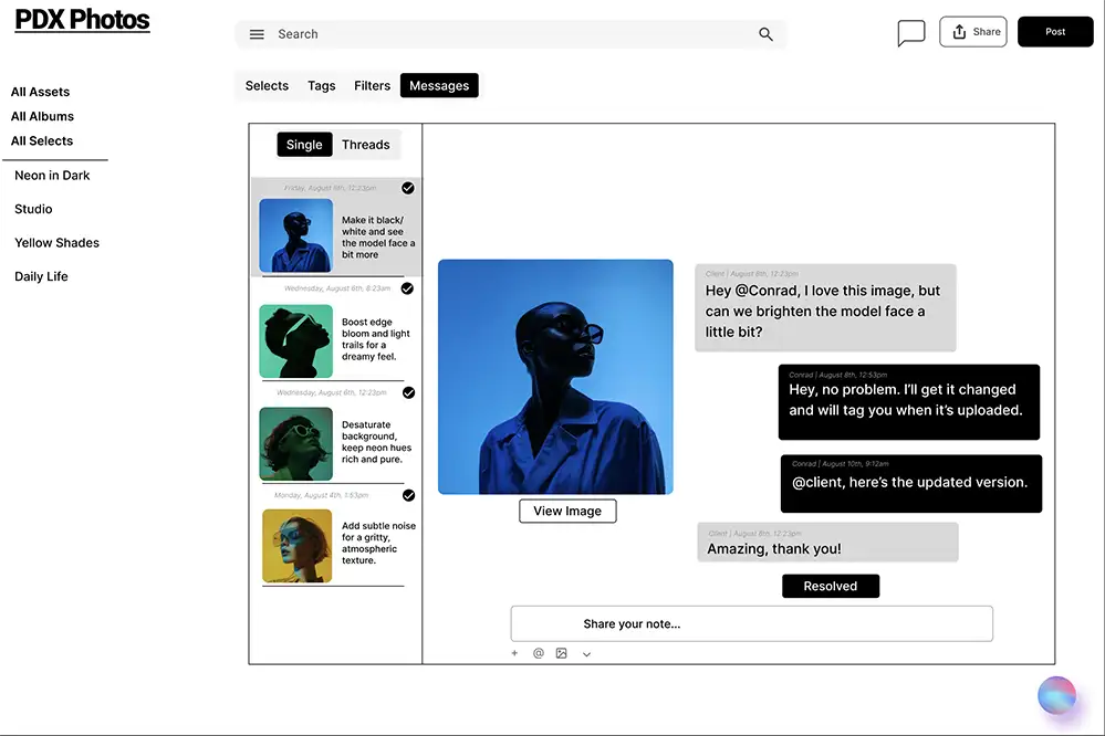 One place for everything your clients need. No more digging through emails or folders. Clients get a single hub for final assets, selects, notes, and downloads so nothing gets lost or overlooked.